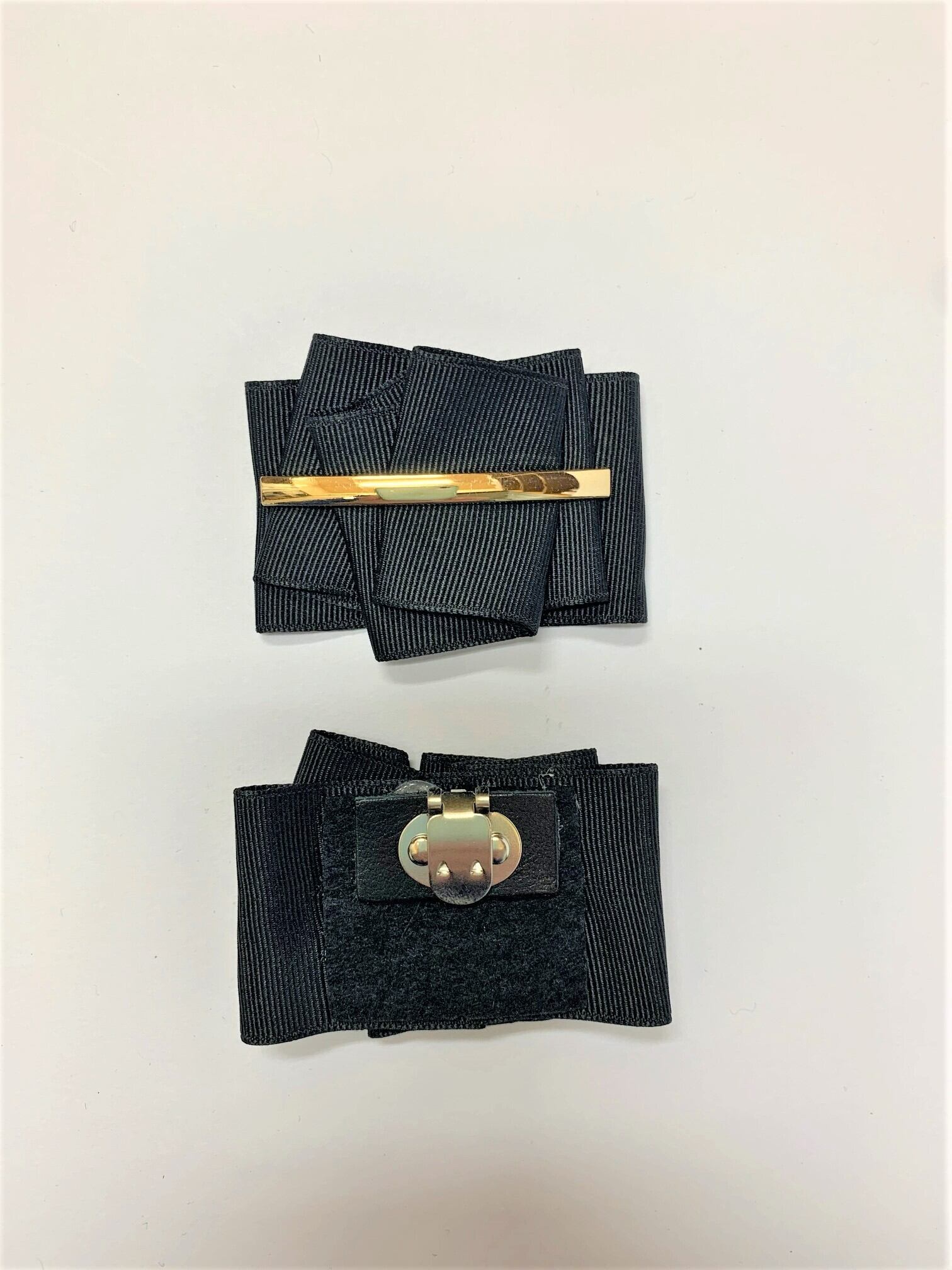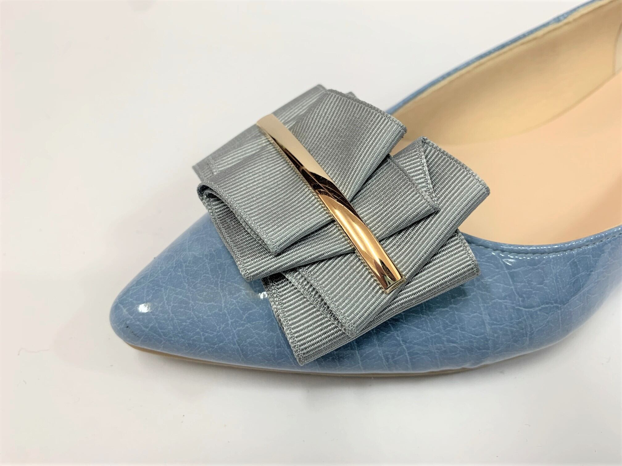 グログランリボンを折り重ね、キラッと輝く金具で止めたデザインのシューズリボンです。