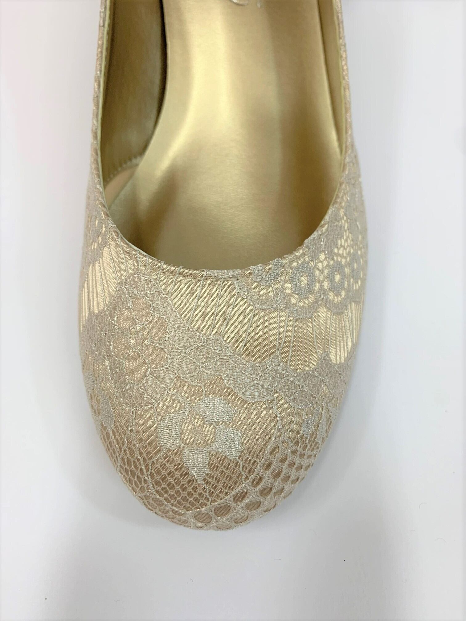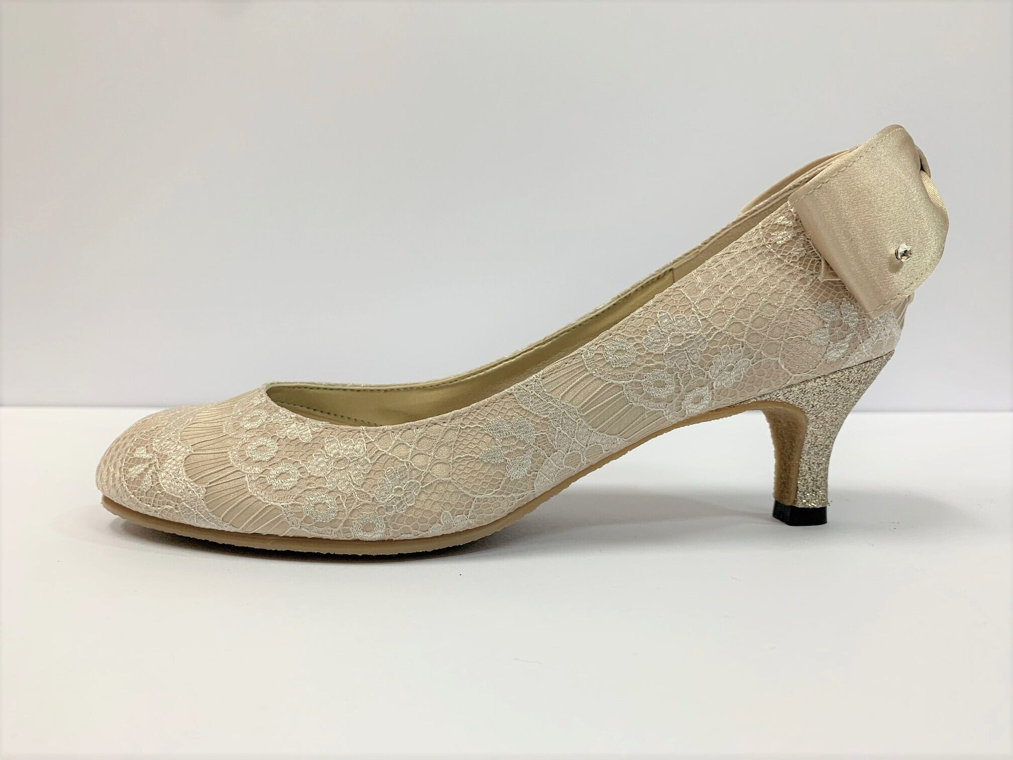 優しいラウンドトゥにサテンレースを合わせ、イベントや普段履きにも使えるオシャレなパンプスです。