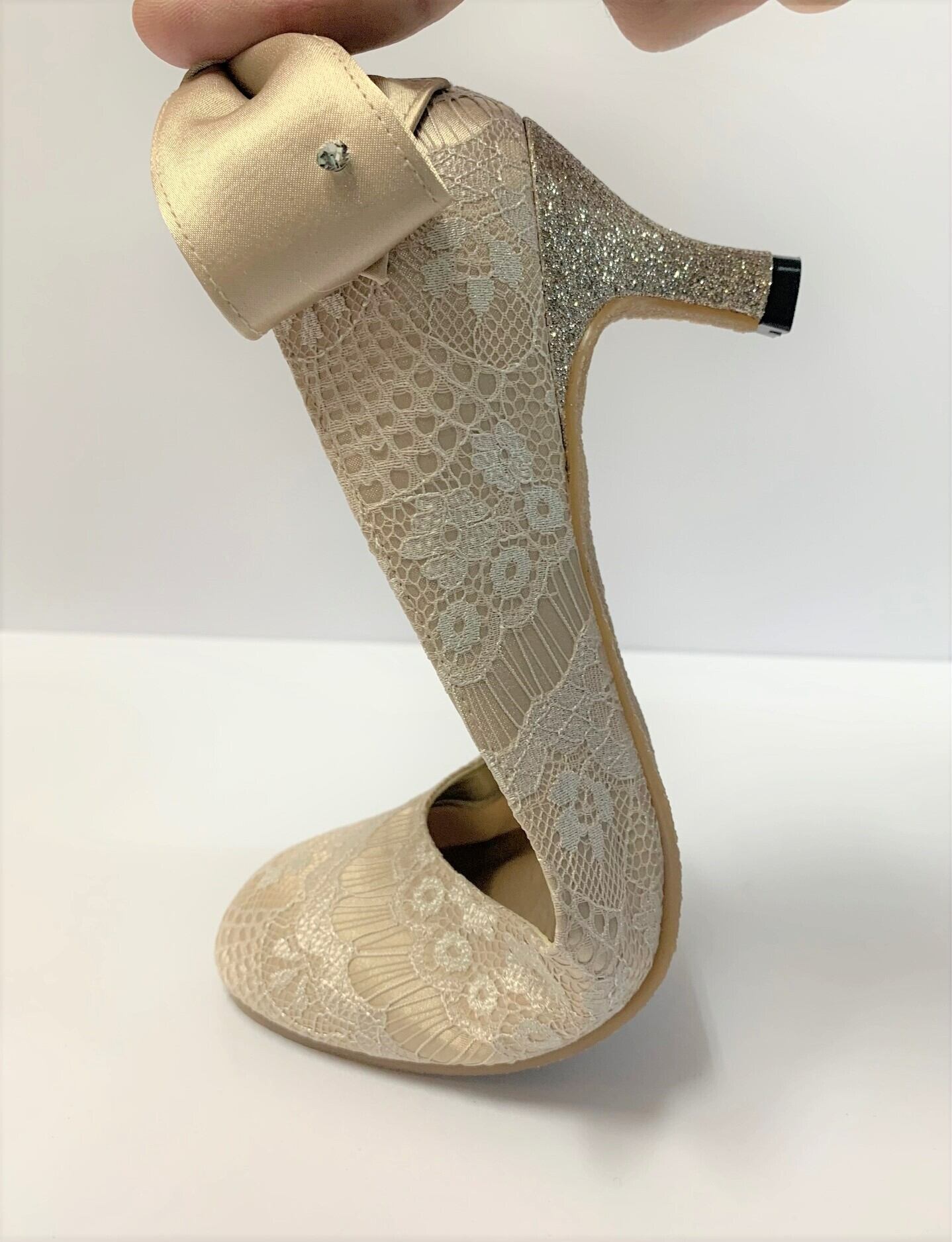 歩くとキラッと輝くダイヤストーン付きリボンと、キラキラ素材で巻いたヒールが、かわいくエレガントなスタイルに仕上げています。
